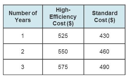 ![\left[\begin{array}{ccccc}Number~of~years&|&high-efficiency~cost&|&point\\1&|&525&|&(1, 525)\\2&|&550&|&(2, 550)\\3&|&575&|&(3,575)\end{array}\right]](https://tex.z-dn.net/?f=%5Cleft%5B%5Cbegin%7Barray%7D%7Bccccc%7DNumber~of~years%26%7C%26high-efficiency~cost%26%7C%26point%5C%5C1%26%7C%26525%26%7C%26%281%2C%20525%29%5C%5C2%26%7C%26550%26%7C%26%282%2C%20550%29%5C%5C3%26%7C%26575%26%7C%26%283%2C575%29%5Cend%7Barray%7D%5Cright%5D)