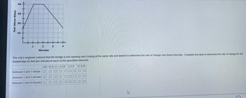 1) Between 0 and 1 minute the rate of change is 25 ft./min