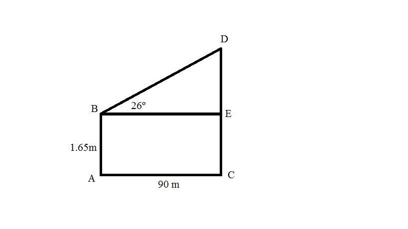 Given : Scarlett is trying to find the height of a dam. She stands 90 meters away from the dam and records the angle of elevation to the top of the dam to be 26º. Scarlett's height is 1.65 meters.