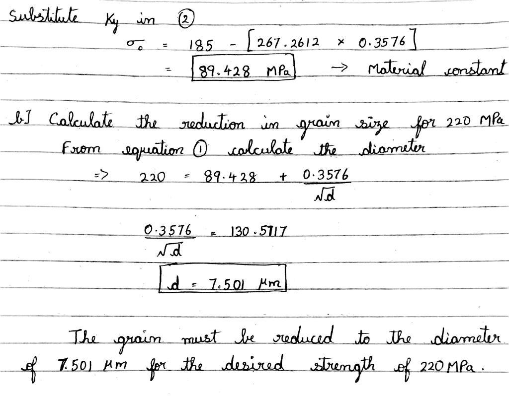 Given that; The average grain diameter of an aluminum alloy is 14 mu m with a strength of 185 MPa. The same alloy with an average grain diameter of 50 mu m has a strength of 140 MPa. (a) Determine the constants for the Hall-Patch equation for this alloy, (b) How much more should you reduce the grain size if you desired a strength of 220 MPa