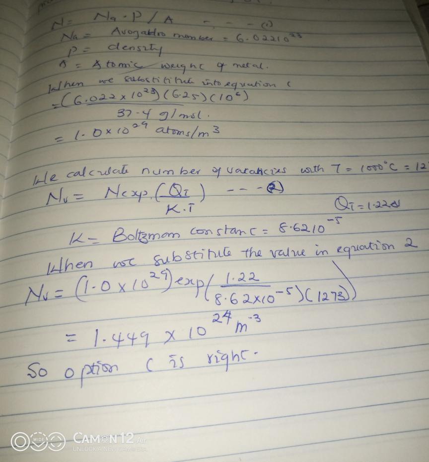 Calculate the number of vacancies per cubic meter at 1000∘C for a metal that has an energy for vacancy formation of 1.22 eV/atom
