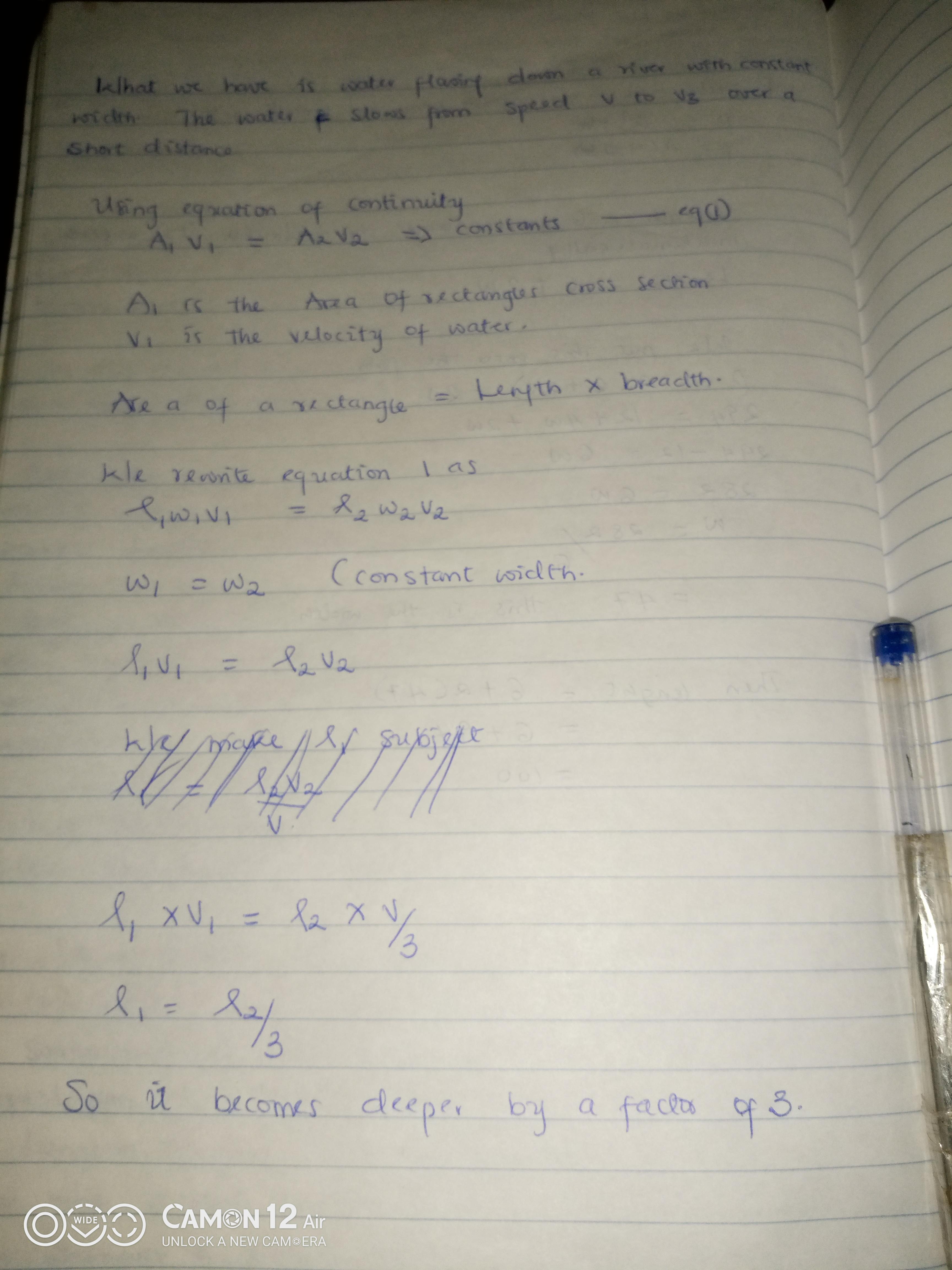 What we have is water flowing down a river with constant width. The water slows from speed v to v3 over a shirt distance