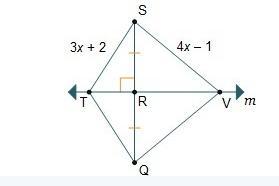 Triangle SRV and triangle RQV are congruent triangles by side angle side congruency (i.e. SR = RQ, RV ≅ RV and ∠SRV = ∠QRV = 90°). Therefore: