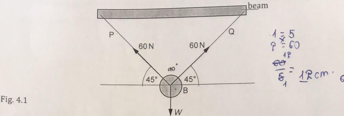 The weight of the heavy ball B suspended from the fixed beam by the ropes = W