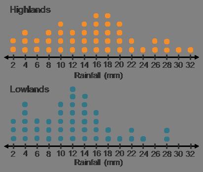 2 dot plots. The highlands have a mean rainfall of 15.27 millimeters, and the Lowlands have a mean rainfall of 12.05 millimeters