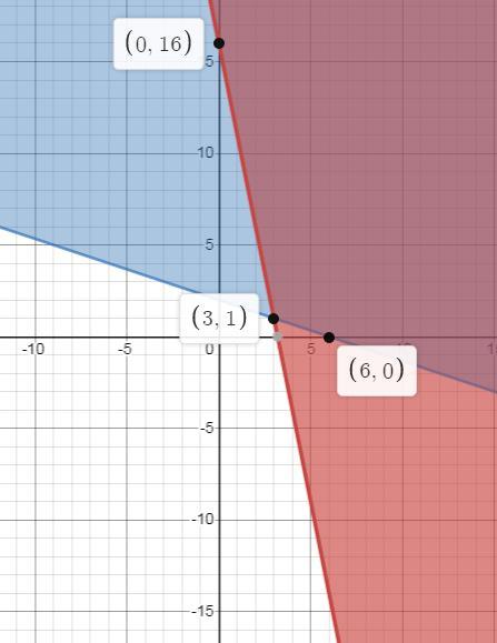 According to the linear programming principle, we predict, that towards the intersections of the constraint points in the viability area, and its optimal solution exists.  The sketch shows the points that are (0,16), (3,1), and (6,0).