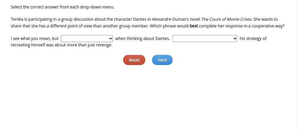 Tenika is participating in a group discussion about the character Dantes in Alexandre Dumas's novel The Count of Monte Cristo. S