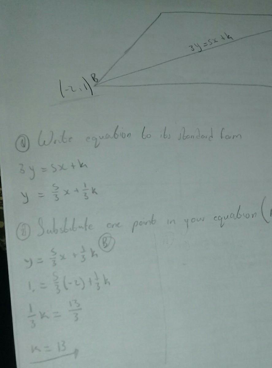 the eqition of the diagonal of a parallelogarm is 3y=5x+k . the two opposite vertices of a parallelogram are the points (1,-2),(