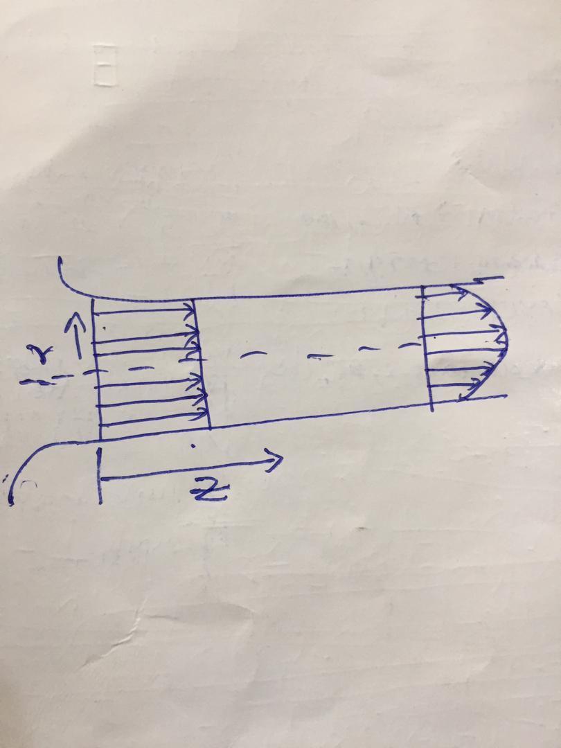 Consider a steady developing laminar flow of water in a constant-diameter horizontal discharge pipe attached to a tank. The flui