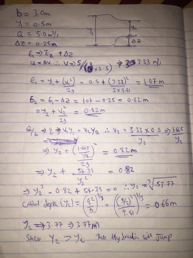 A rectangular channel 3.0 m wide has a flow rate of 5.0 m3/s with a normal depth of 0.50 m. The flow then encounters a dam that