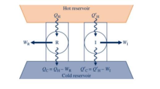 A reversible power cycle R and an irreversible power cycle I operate between the same hot and cold thermal reservoirs. Cycle I h
