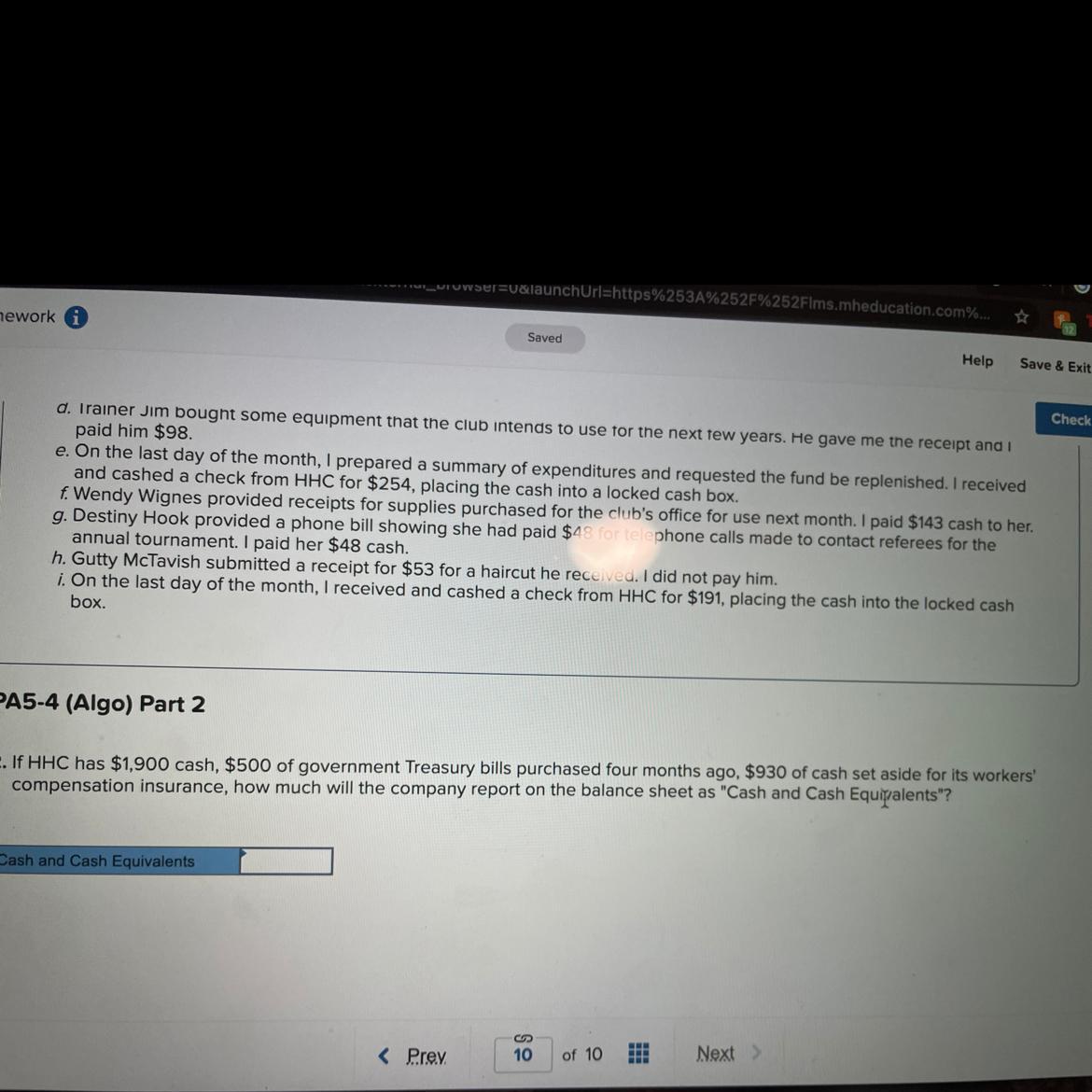 If HHC has $1,900 cash, $500 of government Treasury bills purchased four months ago, $930 of cash set aside for its workers' com