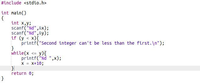 Write a program whose input is two integers. Output the first integer and subsequent increments of 10 as long as the value is le