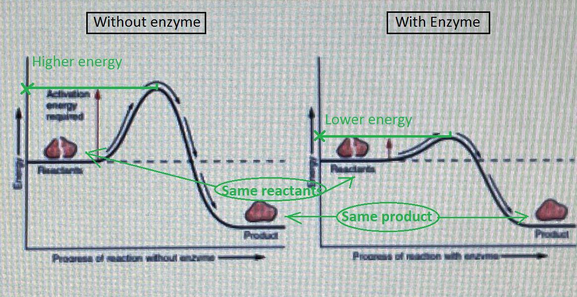 - reactions with enzymes ⇒ reach the <em>same product</em> using the <em>same reactants</em>, but they need a <em>lower </em><em>activation energy </em><em>to occur as the reaction rate increases.</em>