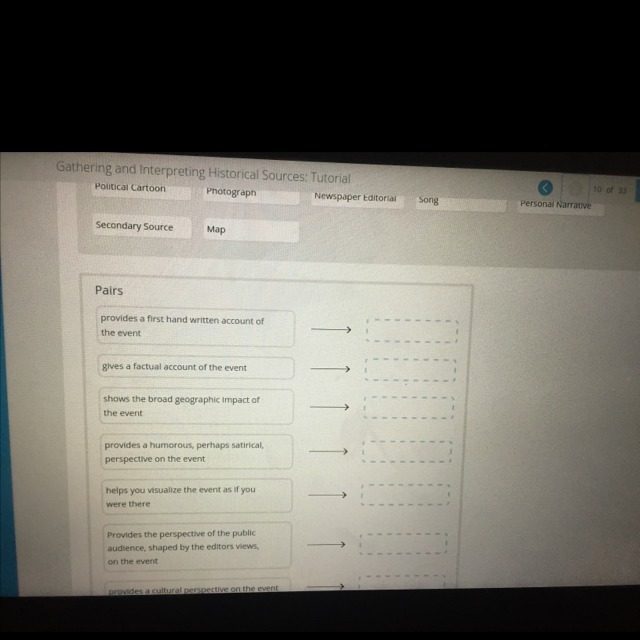 Secondary sources on the other hand, are materials that interpret and analyze the event, they are created after the event and provide an impersonal analysis to get more close to the events, an example could be newspaper editorials, maps and political cartoons.