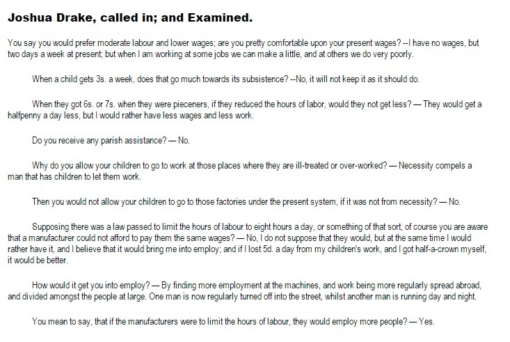 Joshua Drake allows his children to work in the textile factories because of NECESSITY.