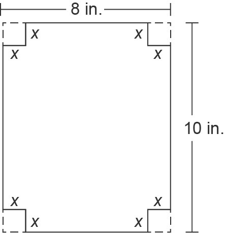 1. A box without a top is to be made from a rectangular piece of cardboard, with dimensions 8 in. by 10 in., by cutting out squa