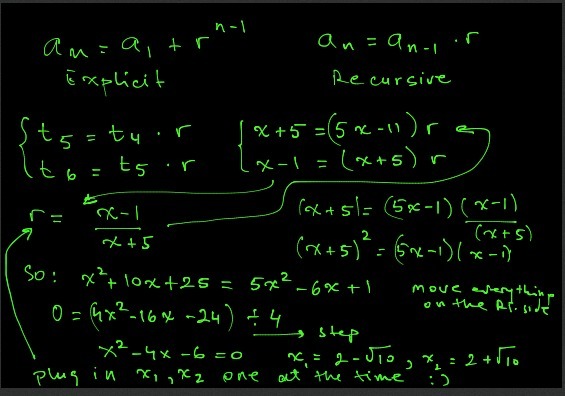 In a geometric sequence, t4=5x-11, t5=x+5, and t6=x-1. Find the sum(s) of the infinite series if it (or they) exsit(s).
