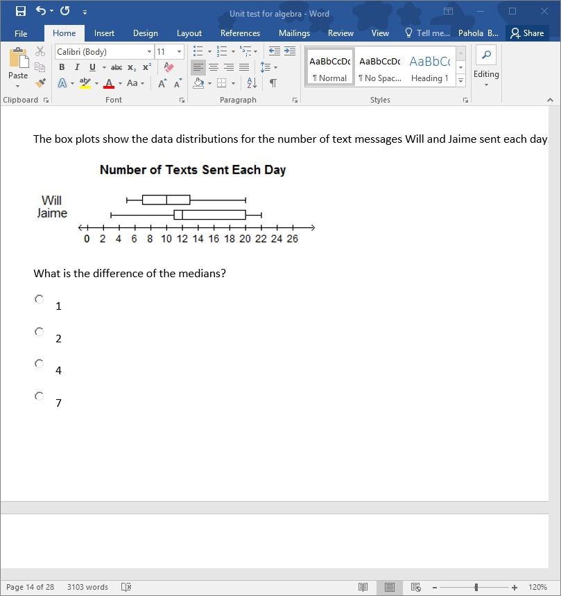 The box plots show the data distributions for the number of text messages Will and Jaime sent each day.What is the difference of