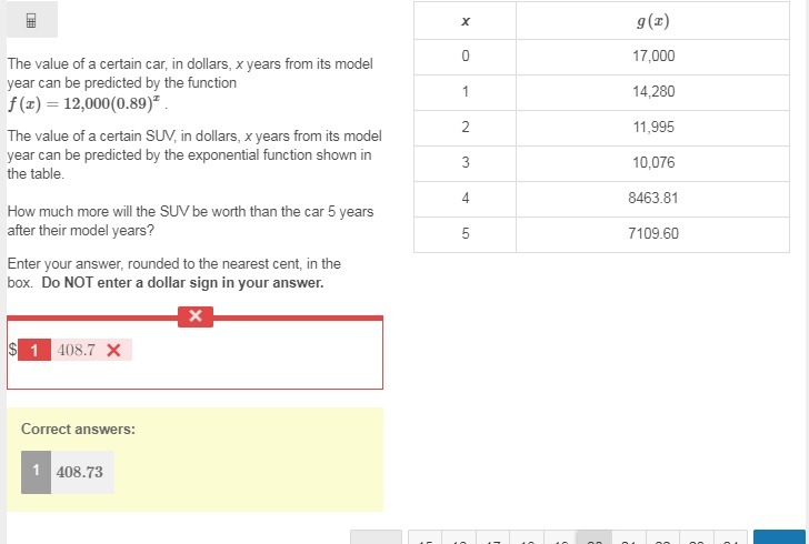 lue of a certain SUV, in dollars, x years from its model year can be predicted by the exponential function shown in the table.