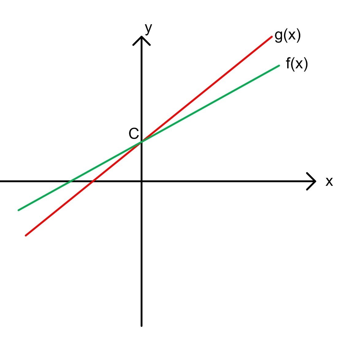 The graph that represents possible functions is shown in the diagram below. Point C shows the point on y-axis where f(x) and g(x) crosses. The result should be interpreted by the level of steepness of each slope