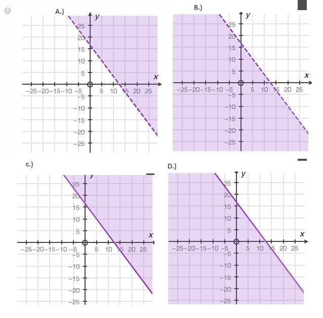 Let x represent the number of yogurt sundaes y represent the number of yogurt cones, so 4x+3y≤50 Subtract 4x to each side 4x+3y≤50-4x 3y≤-3x+50 Divided 3 to each side 3y/3≤(-3x+50)/3 y≤-x+50/3 Now, If x and y both equal 0 y≤-x+50/3 0≤0+50/3 0≤50/3 In co, we see that graph B and D both meet requirements, so we need to eliminate one of the to get the right answer, because of the ≤ I will choose D as the correct answer. Hope it help!