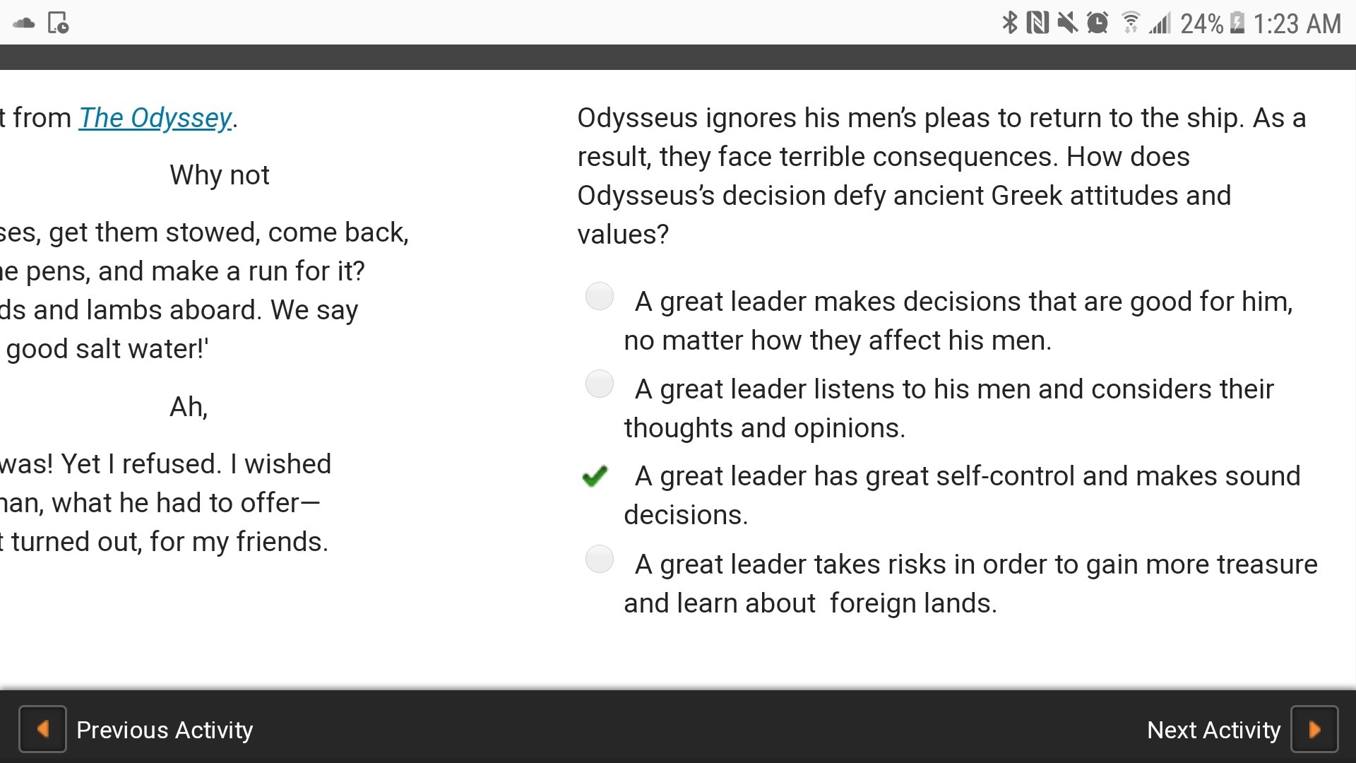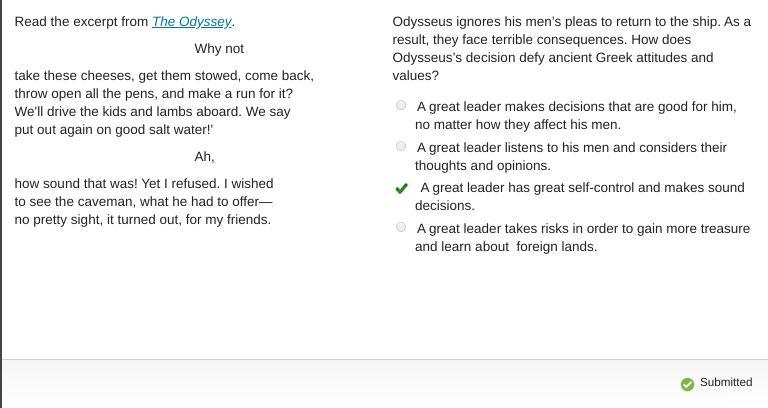 Odysseus ignores his men’s pleas to return to the ship. As a result, they face terrible consequences. How does Odysseus’s decision defy ancient Greek attitudes and values?
