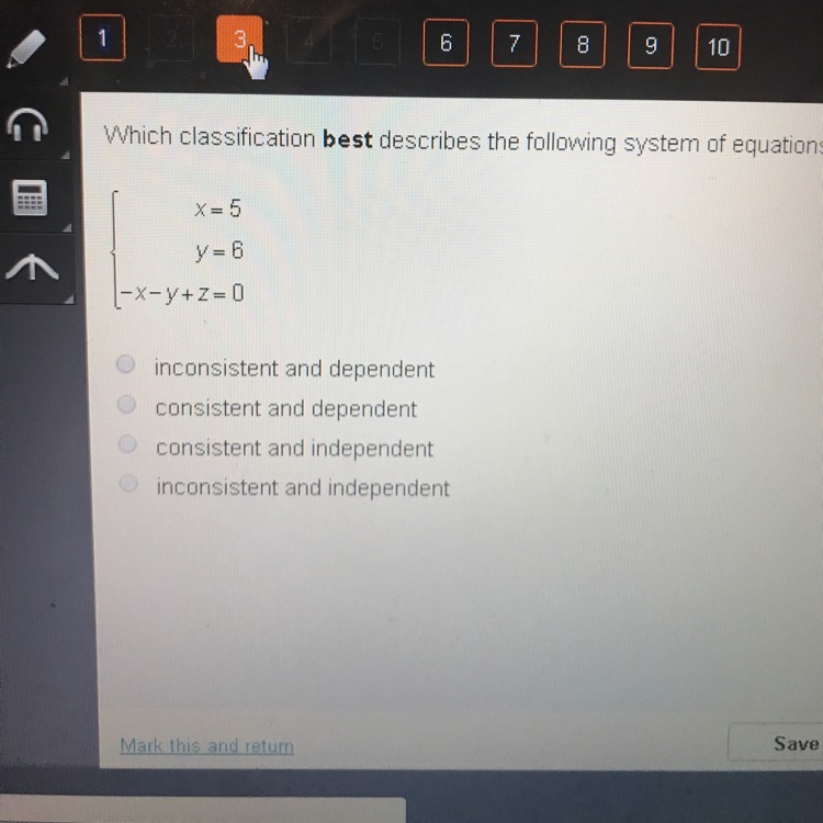 Which classification best describes the following system of equations? X=5, y=6, -x-y+z=0