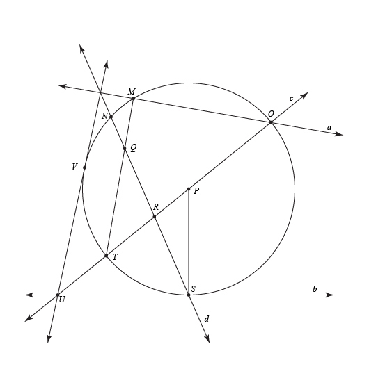 From the indicated right triangles ΔUPV, ΔUPS, ΔMOT, we can calculate the lengths of PU, US, UV, MT and MO.