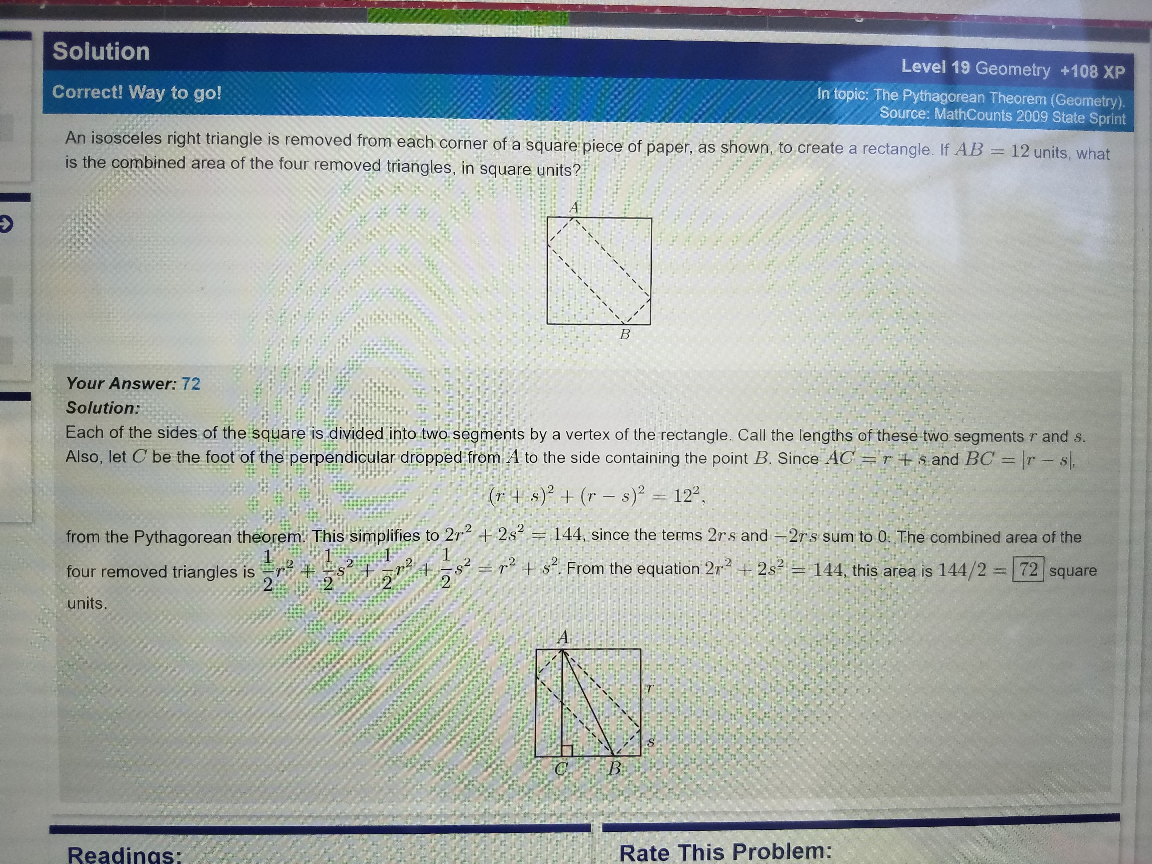 An isosceles right triangle is removed from each corner of a square piece of paper, as shown, to create a rectangle. if $ab = 12