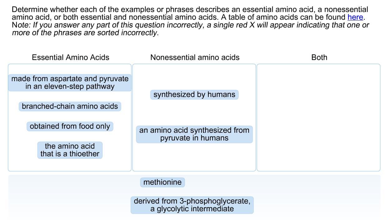 Determine whether each of the examples or phrases describes an essential amino acid, a nonessential amino acid, or both essential and nonessential amino acids. a table of amino acids can be found here.