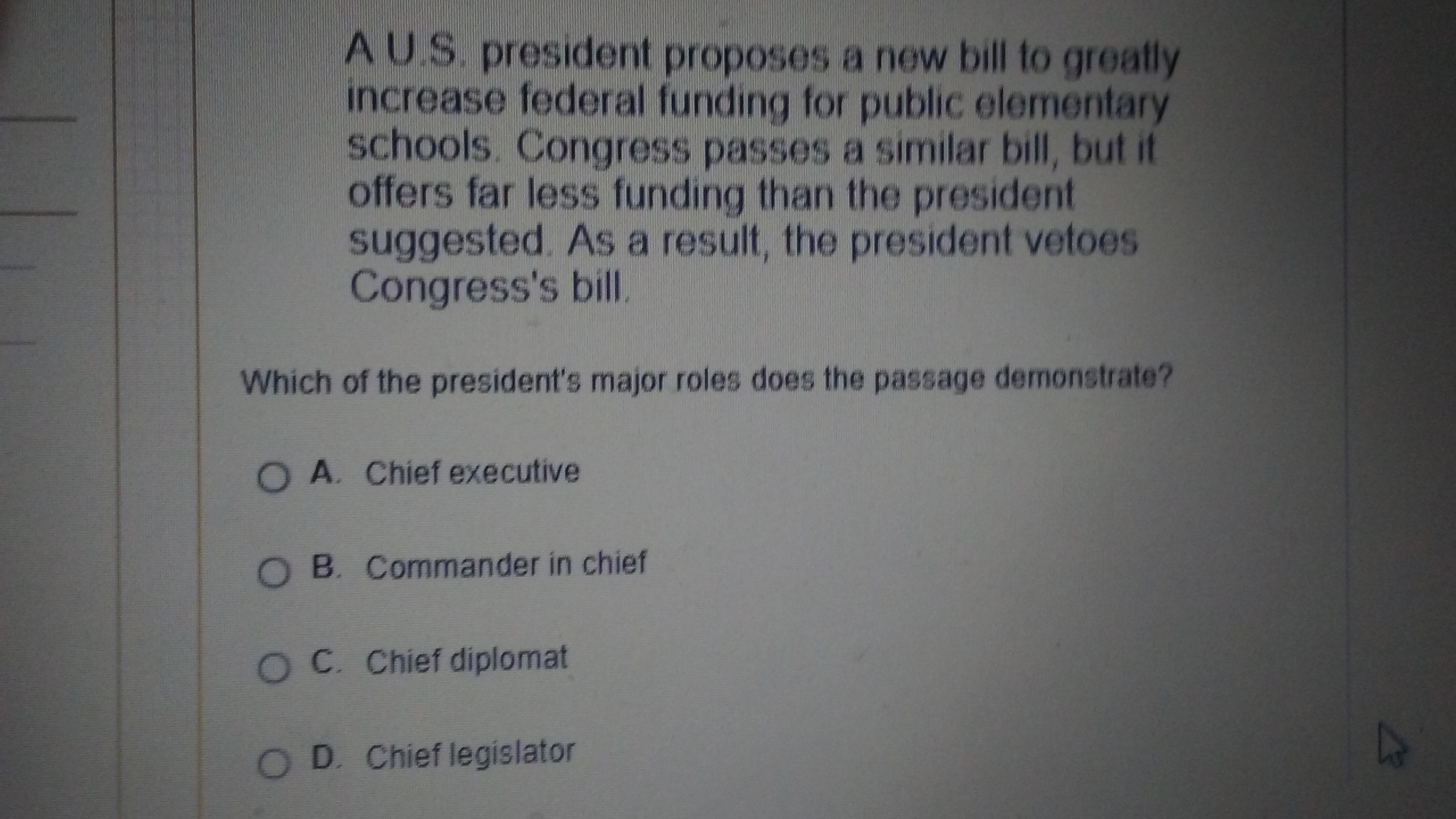 The president has many roles that he plays, one of them is the role of the chief legislator. The chief legislator is responsible for signing or vetoing new legislation. The president has the power to influence the congress in  its duty of lawmaking.