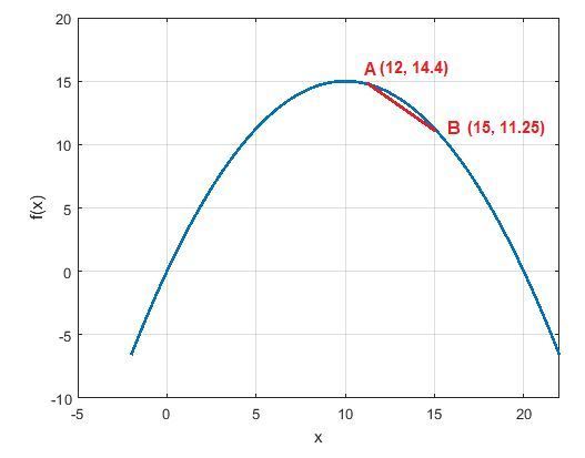 This rate of change represents the slope of the secant line from A to B. It approximates the rate at which f(x) decreases in the interval x =[12, 15].