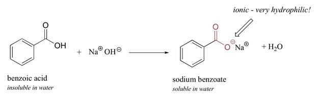 Benzoic acid reacts with sodium hydroxide based on the equation shown in the attached picture.