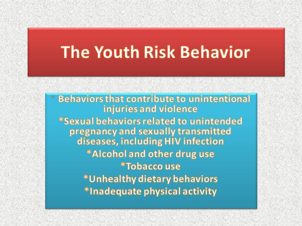 Youth Risk Behavior like smoking, drinking, drug use, diet, and physical activity occur because adolescents are still in the developing stage, it is inconceivable that injuries, pregnancy, or accidents can occur to them