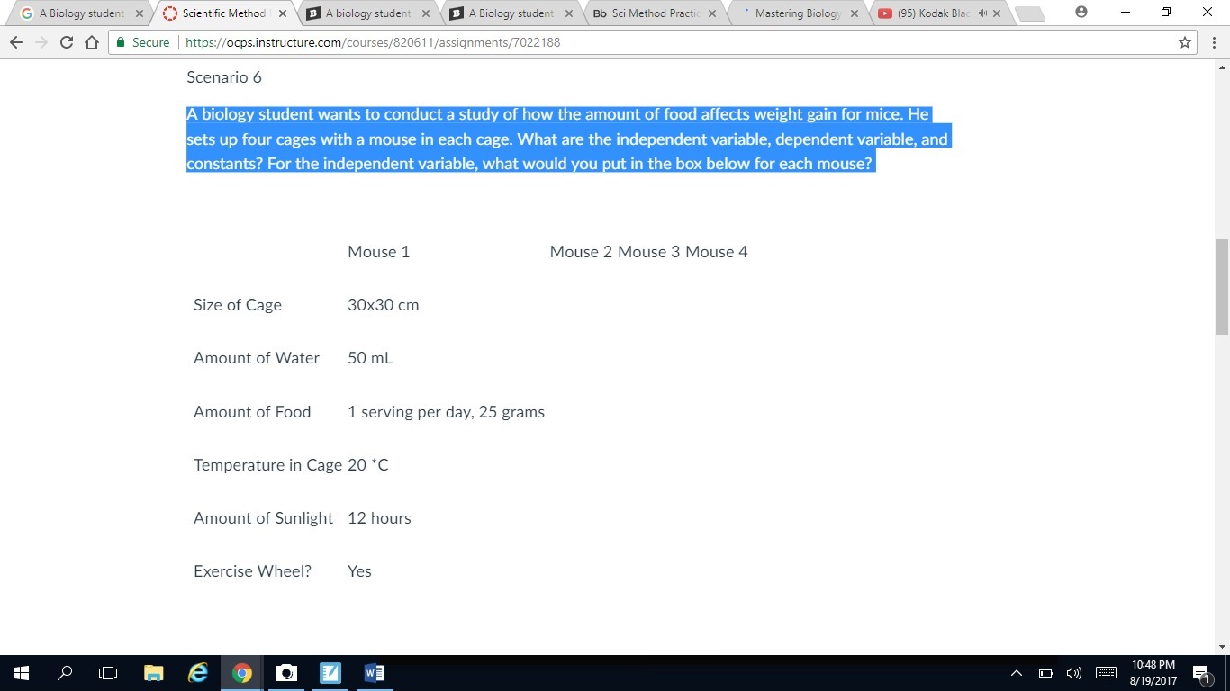 mouse in each cage. What are the independent variable, dependent variable, and constants? For the independent variable, what would you put in the box below for each mouse?