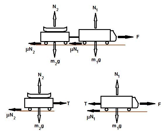 μN₁ and μN₂ are frictional forces, where  =  kinetic coefficient of friction