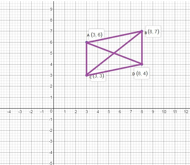 The coordinates of the endpoints of are A(3, 6), B(8, 7), C(3, 3), and D(8, 4).