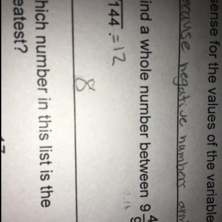 To find : Whole number between 9\frac{4}{9} and \sqrt{144}?
