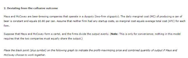 Mays's deviation from the collusive agreement causes the price of a can of beer to (increase/decrease?) to $___________________ per can. Mays's profit is now $______________, while McCovey's profit is now $______________. Therefore, you can conclude that total industry profit (increases/decreases?) when Mays increases its output beyond the collusive quantity.