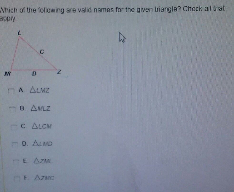 Which of the following are valid names for the given triangle below? Check all that apply.