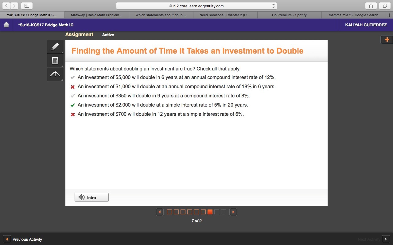 It will take 9 years to double the investment. This statement is true.