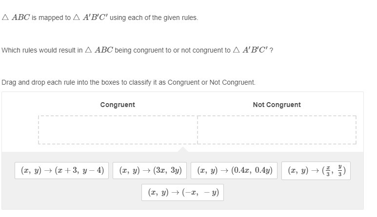 Not Congruent: (x, y)→(3x, 3y); (x, y)→(0.4x, 0.4y); (x, y)→(x/3, y/3)
