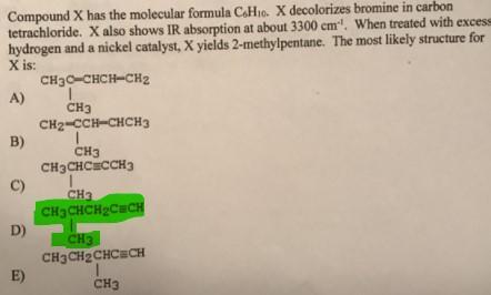Alkynes and alkenes both decolorized bromine in carbon tetrachloride. The absorption of the IR at about 3300 cm-1 for the X here that are found in the terminal alkynes absorption range only. In presence of excess hydrogen and a nickel catalyst, x gives the 2-methyl pentane.