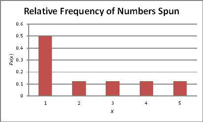 Given : A spinner is divided into five sections numbered 1 through 5. Juana records the number the spinner lands on for each of 50 spins. She computes and graphs the relative frequencies for each number.