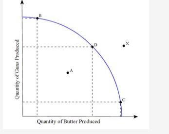 The opportunity cost would be decreasing only if each point along the curve between points B and D has a lower opportunity cost than the previous point. This would come to the point where decreasing food production in exchange for guns production would not be so expensive, meaning it would not have a high opportunity cost. Otherwise, increased guns production would be a sacrifice for the population, which could be without food, as no C-point that increases guns production drastically reduces food production. At this point, the opportunity cost of producing more guns is extremely high and is not nearly food shortage.