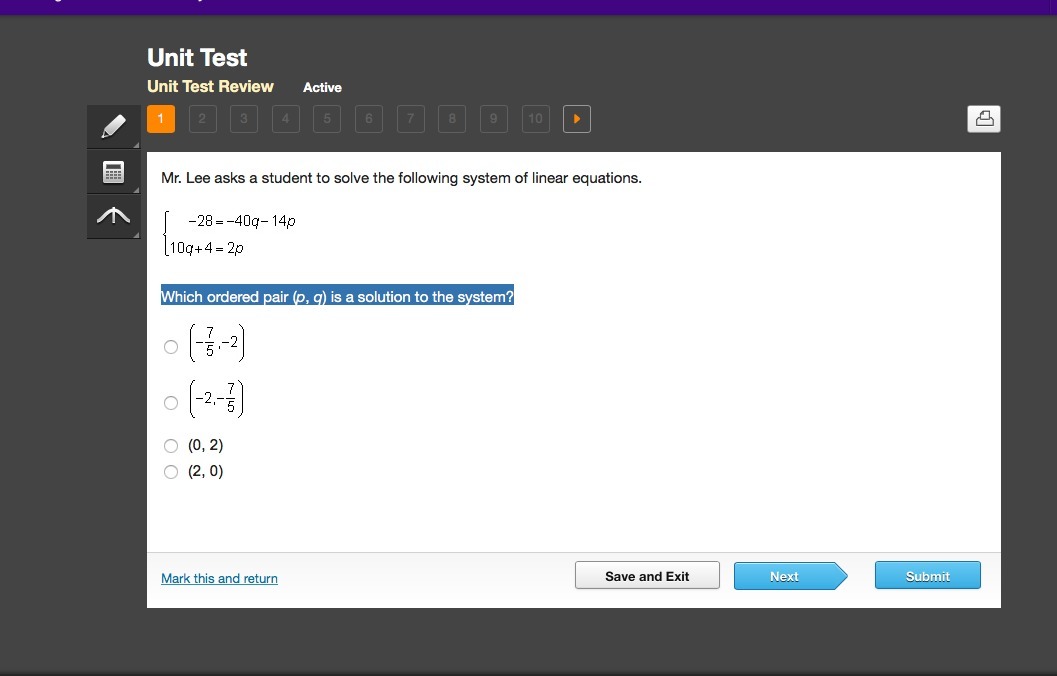 Mr. Lee asks a student to solve the following system of linear equations. Which ordered pair (p, q) is a solution to the system?