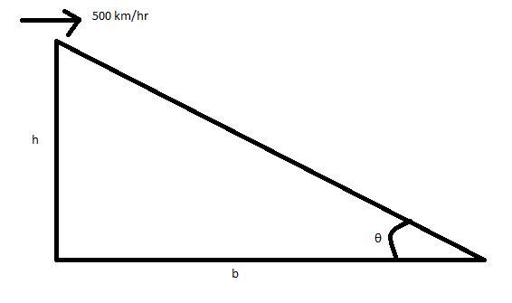 \frac{dh}{dt}=0\\\\\frac{db}{dt}=-500km/hr\\\\\theta =\frac{\pi }{4}\\\\tan\frac{\pi }{4}=\frac{h}{b}\Rightarrow 1=\frac{5}{b}\Rightarrow b=5km