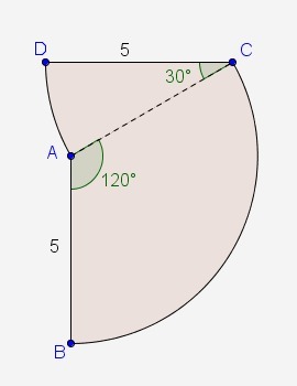The length BC is the length of an arc subtended by angle 120 degrees at the center of a circle of radius 5. Recall that the length of an arc, l, subtended by an angle, x degrees, in the center is given by l = 120 / 360 x pi x 2r Thus, BC = 120 / 360 x 3.14 x 2 x 5 = 10.4667 Similarly, length DA is the length of an arc subtended by angle 30 degrees at the center of a circle of radius 5.Thus, DA = 30/360 x 3.14 x 2 x 5 = 2.6167 Therefore, the approximate length of boundary ABCD = 5 + 10.4667 + 5 + 2.6167 = 23.0834 = 23.1 to one decimal place.