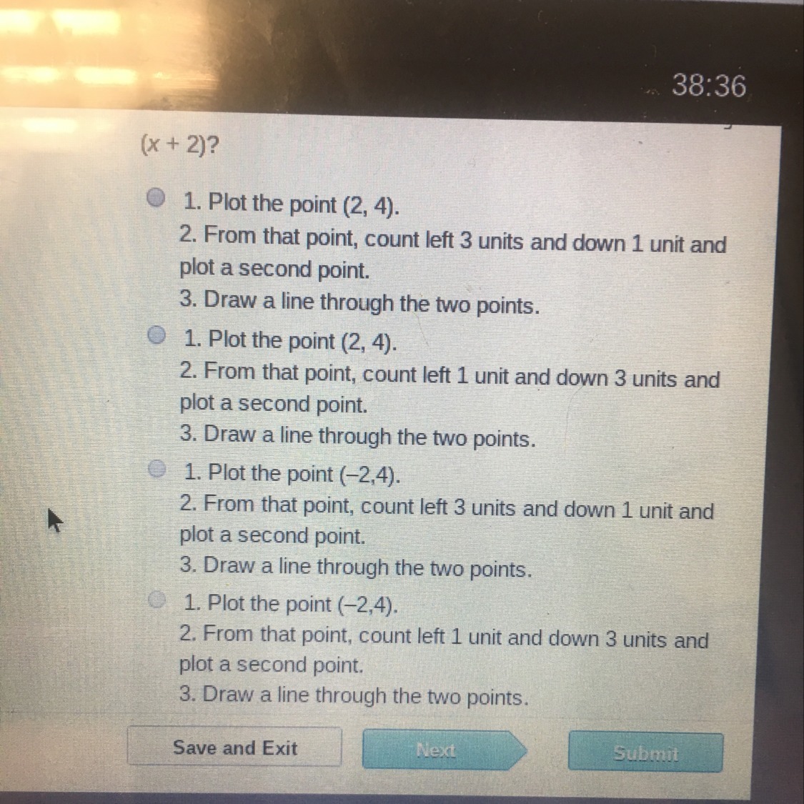 Alright, first off what you want to do with this equation is to get the y by itself, so move the 4 over to the other side which would make it a function. The first two option are not correct as the two inside of the bracket have to switch signs when you graph them. When you are looking at 1/3, you look at it as rise over run, meaning that you would count left 1 unit and down 3 units. So the last option would be your answer.